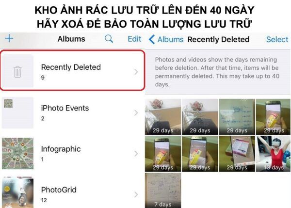 Một trong những thứ ngốn bộ nhớ trên iPhone nhất đó là ảnh và video trong thùng rác. Những thứ này sẽ làm cho chiếc điện thoại bạn trở nên chật chội hơn. Khi bạn xoá một bức ảnh hay một cái video bất kỳ thì chúng sẽ mặc định được chuyển vào trong hộp thoại thùng rác trong ứng dụng Ảnh, mà thời gian chờ để xoá vĩnh viễn những bức ảnh lên đến 40 ngày.