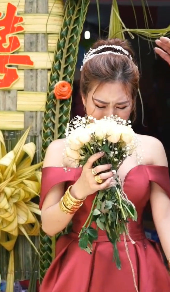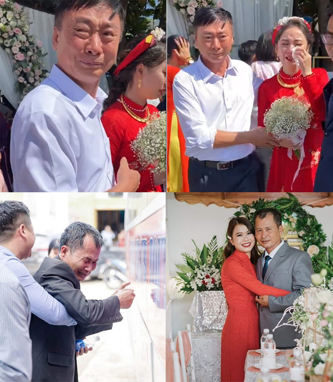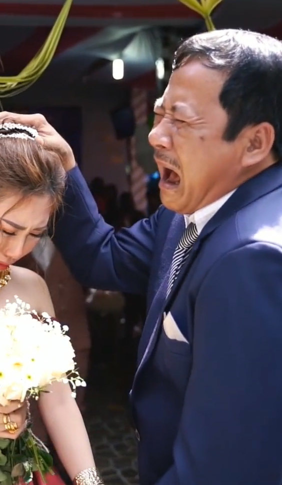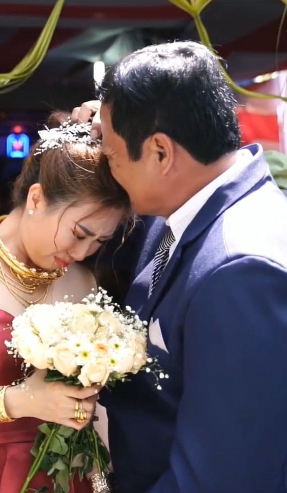 Dường như vừa lo lắng vừa thương con, bố đã bật khóc nức nở. Bình thường nghiêm nghị là thế nhưng trong khoảnh khắc này, khi con gái nắm tay, bố trở nên yếu đuối, chẳng thể kìm nén nổi những giọt nước mắt. Một lúc sau, ông còn hôn lên tóc con gái căn dặn phải sống tốt và hạnh phúc. Bố còn quay sang nắm chặt tay con rể dường như muốn nói rằng hãy yêu thương và bao bọc tốt cô công chúa nhỏ của mình. Thậm chí đến lúc lên xe ra về, được mọi người an ủi nhưng bố vẫn không thể ngừng khóc.