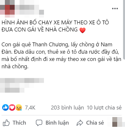 Mới đây, mạng xã hội đã chia sẻ hình ảnh người bố đi xe máy theo ô tô để đưa con về nhà chồng. Được biết, con gái quê Thanh Chương, lấy chồng ở Nam Đàn. Mặc dù có đủ ô tô nhưng bố nhất quyết đi xe máy để theo con về tận nhà thông gia. Không rõ nguyên nhân vì sao ông bố phải tự chạy xe như vậy nhưng nhìn hình ảnh lo lắng của bố, ai cũng nghẹn lòng.