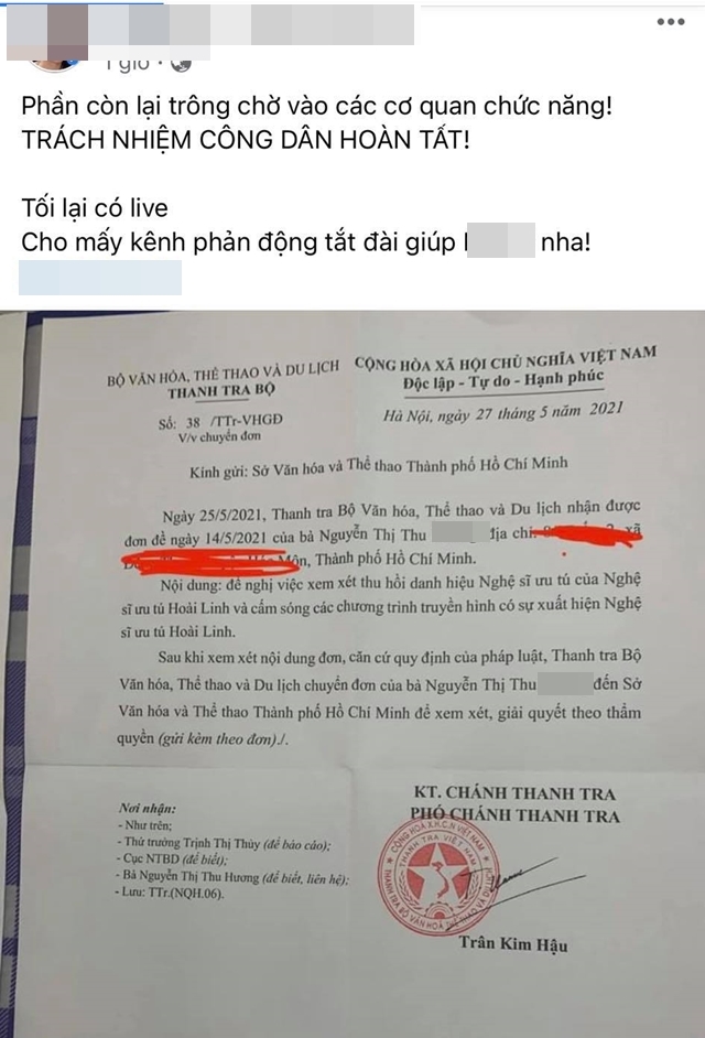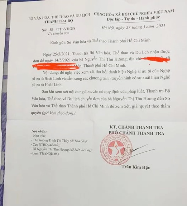 Nội dung trong công văn có ghi rõ, Thanh tra Bộ Văn hóa, Thể thao và Du lịch nhận được đơn đề nghị của một công dân với nội dung: “Đề nghị xem xét thu hồi danh hiệu Nghệ sĩ ưu tú của Nghệ sĩ Hoài Linh và cấm sóng các chương trình truyền hình có sự xuất hiện của Nghệ sĩ ưu tú Hoài Linh”.