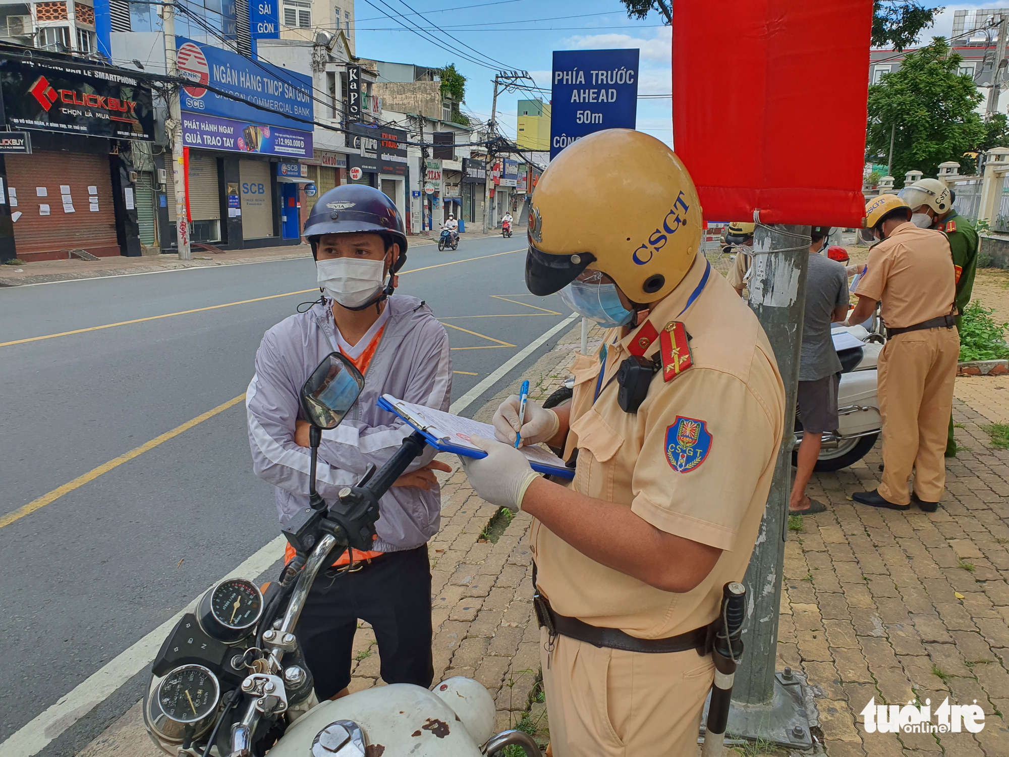 Lực lượng CSGT-TT Công an TP Thủ Đức (khu vực 3) xử lý người dân vi phạm khi ra đường không thật sự cần thiết vào sáng 27-7 - Ảnh: MINH HÒA