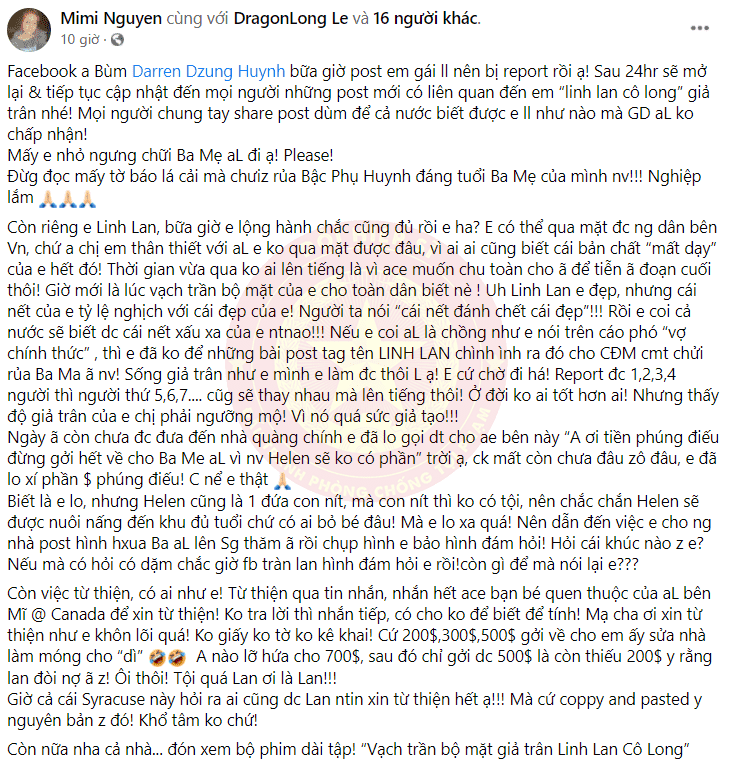Người này cho rằng bản tính “mất dzại” của Linh Lan bạn thân của nam CS ở bên Mỹ không ai là không biết, sở dĩ mọi người không lên tiếng là vì để lo chu toàn cho đ.ám τang Vân Quang Long.