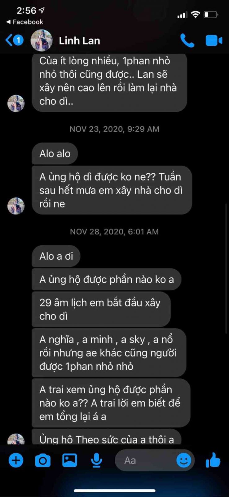 Còn việc từ thiện, có ai như em! Từ thiện qua tin nhắn, nhắn hết anh chị em bạn bè quen thuộc của anh Long bên Mĩ, Canada để xin từ thiện! Không trả lời thì nhắn tiếp, có cho không để biết để tính! Mạ cha ơi xin từ thiện như em khôn lõi quá! Không giấy không tờ không kê khai! Cứ 200$, 300$, 500$ gởi về cho em ấy sửa nhà làm móng cho “dì”. Anh nào lỡ hứa cho 700$, sau đó chỉ gởi được 500$ là còn thiếu 200$ y rằng Lan ᵭòi ŋợ ã vậy! Ôi thôi! Tội quá Lan ơi là Lan!!!