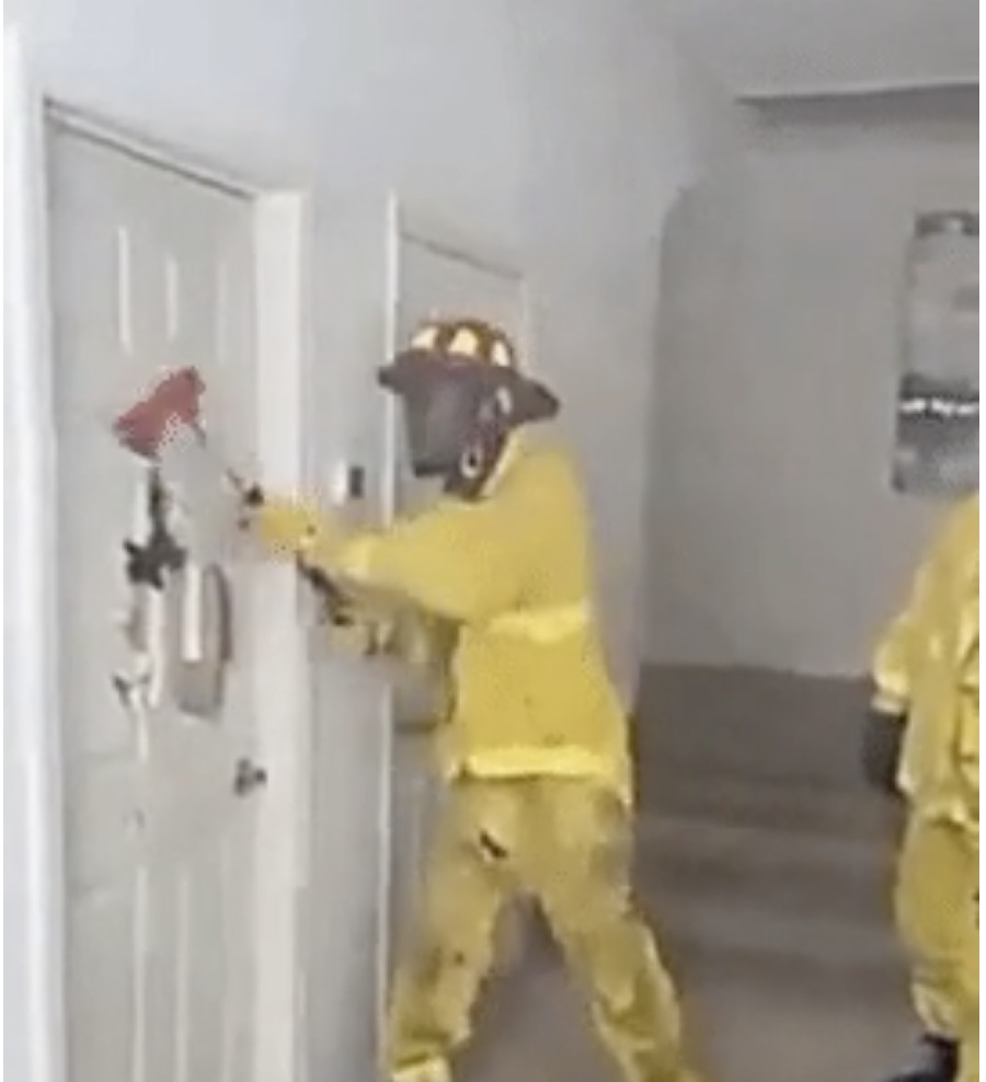 Họ có mặt tại hiện trường, tiến hành phá cửa phòng để giải cứu người ở bên trong. Trong đoạn video có thể thấy, anh chàng hì hục dùng rìu đánh mạnh vào cửa để phá khoá. Khói bên trong liền tản ra ngoài qua những lỗ hổng trên cánh cửa.