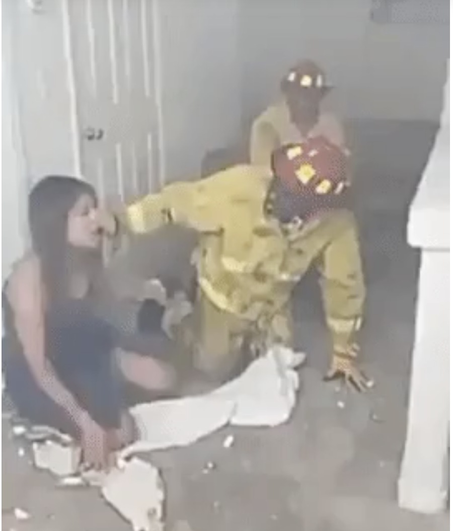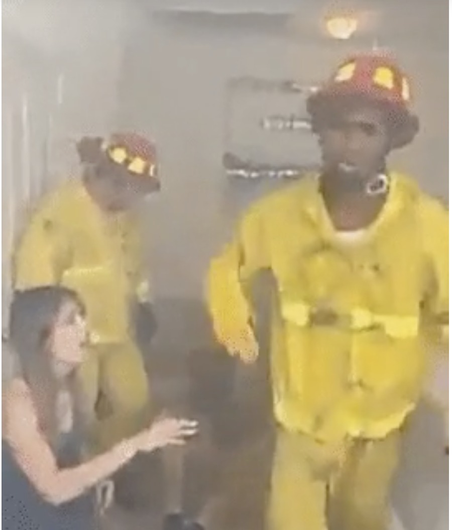 Tuy nhiên, câu chuyện hi hữu bây giờ mới bắt đầu đầu. Sau khi phá được cửa, đôi nam nữ có vẻ lúc trước đó đang ân ái cùng nhau hốt hoảng chạy ra. Chàng trai thì cởi trần còn cô gái ăn mặc khá "thiếu vải", dùng khăn tắm che mặt để không bị ngạt khói.