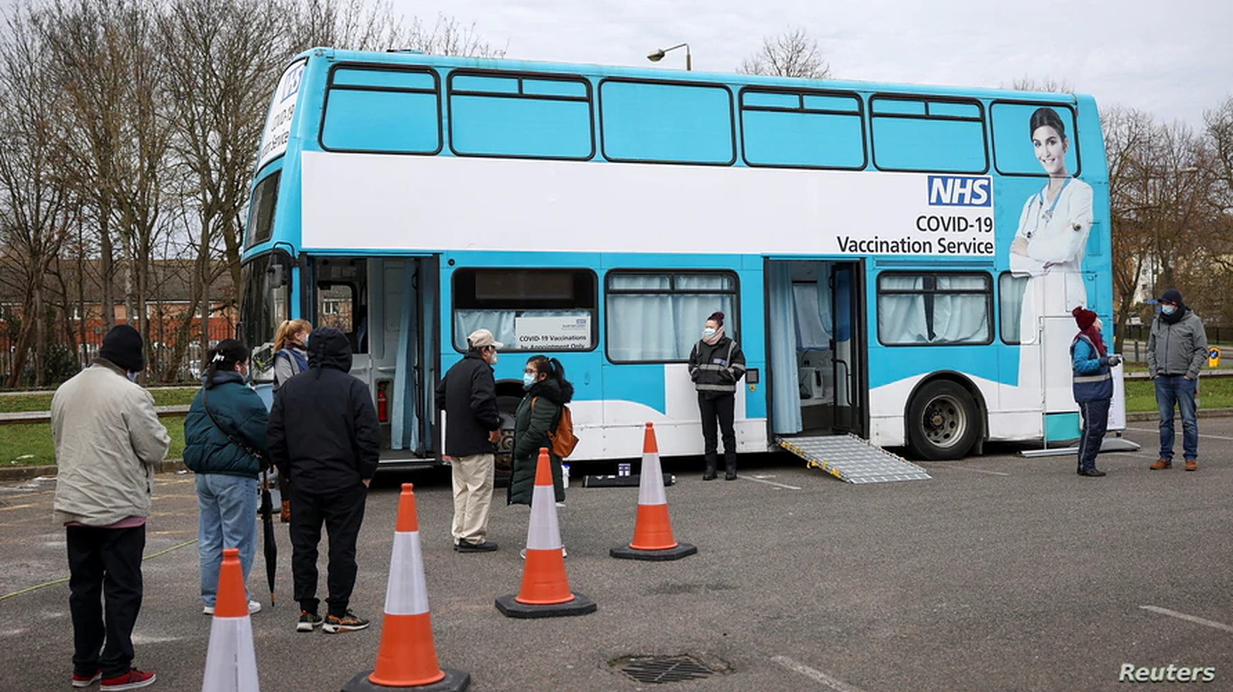 Xe buýt lưu động tiêm vắc xin COVID-19 tại London (Anh) - Ảnh: REUTERS