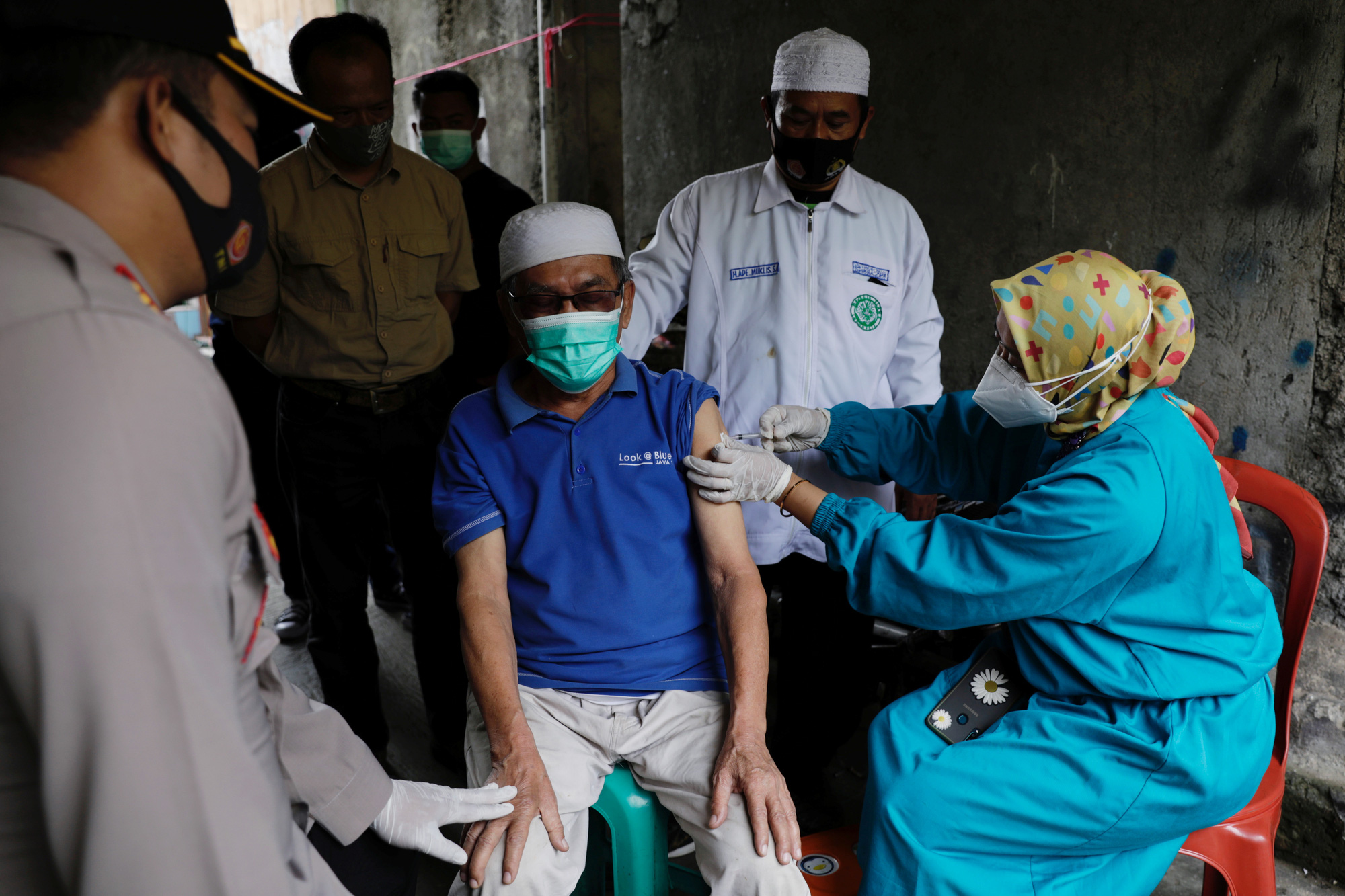 Ông Jeje Jaenudin, 68 tuổi, được tiêm liều vắc xin COVID-19 đầu tiên của Hãng Sinovac (Trung Quốc) tại huyện Cianjur, tỉnh Tây Java, Indonesia hôm 15-6 - Ảnh: REUTERS
