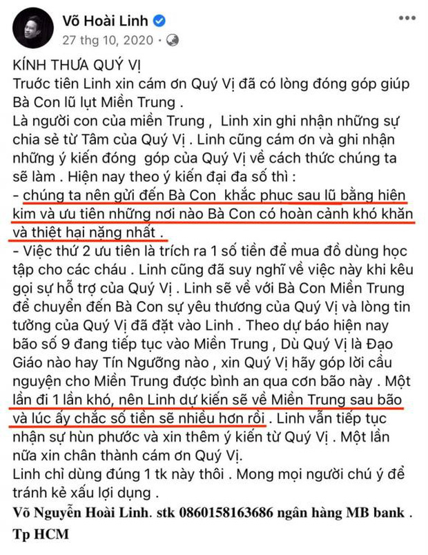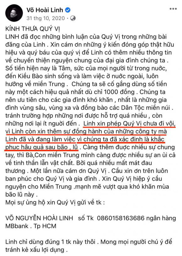 Tuy nhiên, trên MXH mới đây đã có hàng loạt khán giả phát hiện ra 1 điểm rõ ràng nhằm minh oan cho NS Hoài Linh. Theo đó, nếu để ý kỹ dòng trạng thái từng được nam nghệ sĩ đăng lên vào ngày 27/10/2020 và 30/10/2020 để kêu gọi từ thiện, có thể thấy NS Hoài Linh đã nhấn mạnh rõ ràng rằng số tiền quyên góp sẽ được gửi đến miền Trung nhằm khắc phục hậu quả sau lũ.