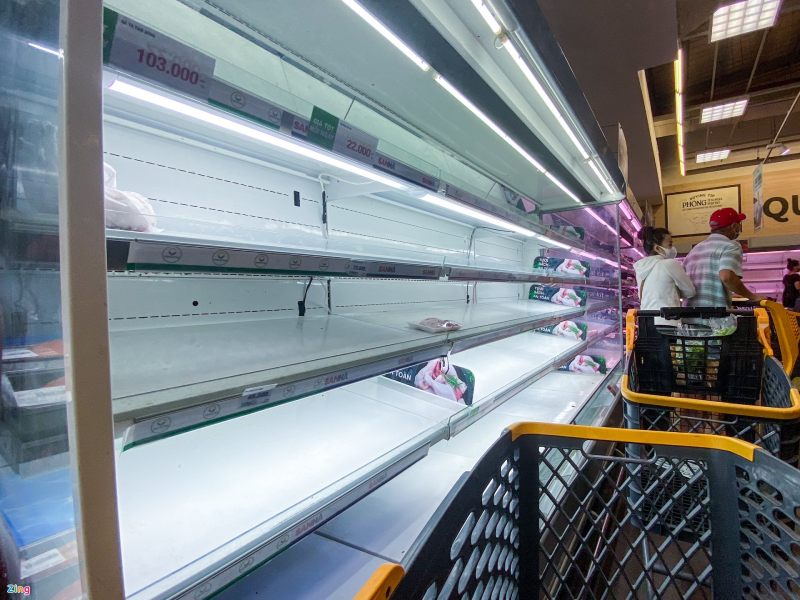Ngày 7/7, các siêu thị tại TP.HCM tiếp tục ghi nhận tình trạng người dân đổ xô đến mua thực phẩm. Một số nơi thiếu hàng tươi sống, một số khác thì vẫn đầy đủ các mặt hàng.