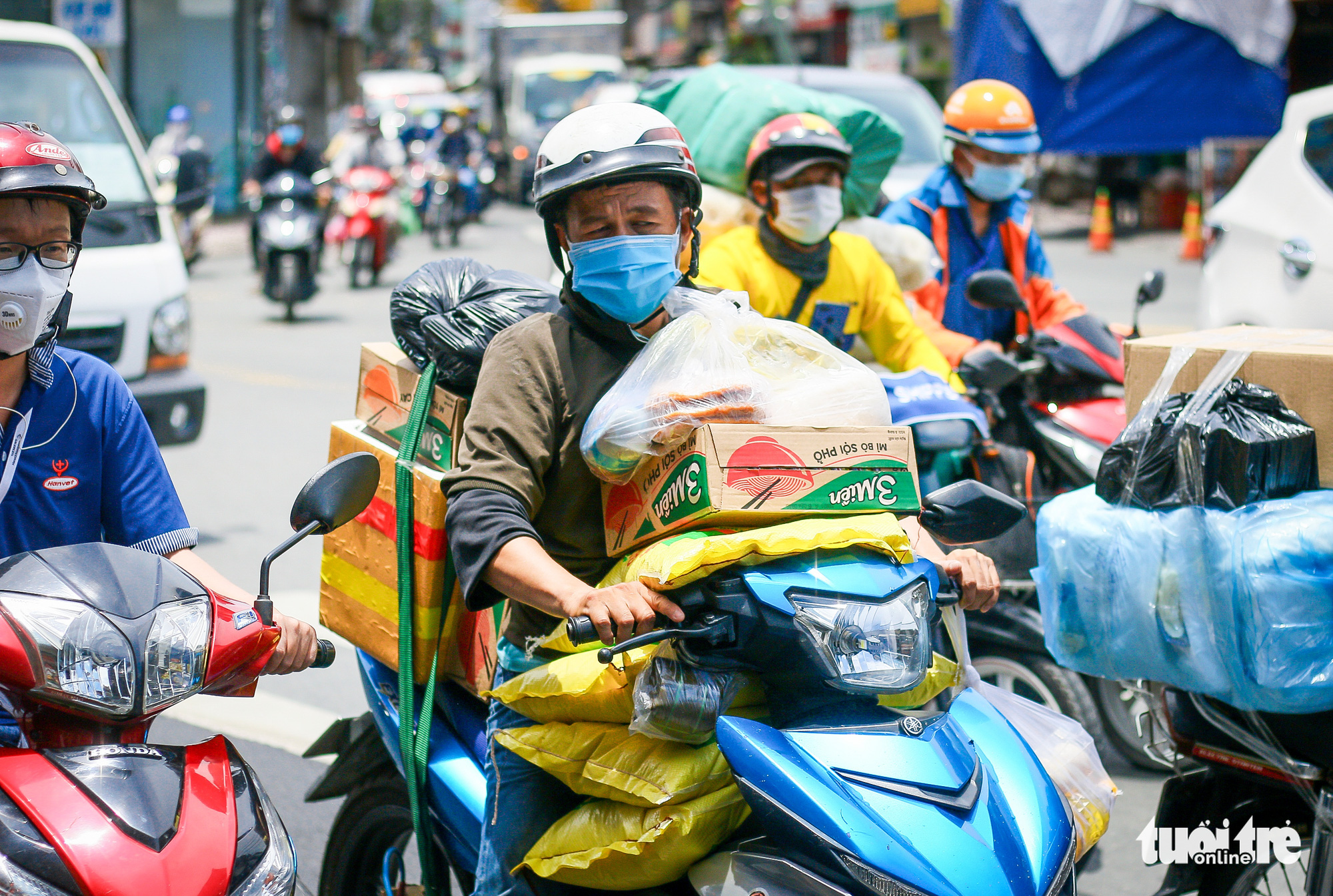 Từ sáng sớm đến trưa cùng ngày, trên đường Tân Kỳ Tân Quý (quận Tân Bình) dòng xe ôtô dài gần 1km nối đuôi nhau nhích từng chút một, nhiều lúc xe máy phải chạy lên vỉa hè để luồn lách qua đoạn ùn ứ. Trên mỗi chiếc xe đều chở theo lỉnh kỉnh thực phẩm như gạo, trứng, rau củ,…