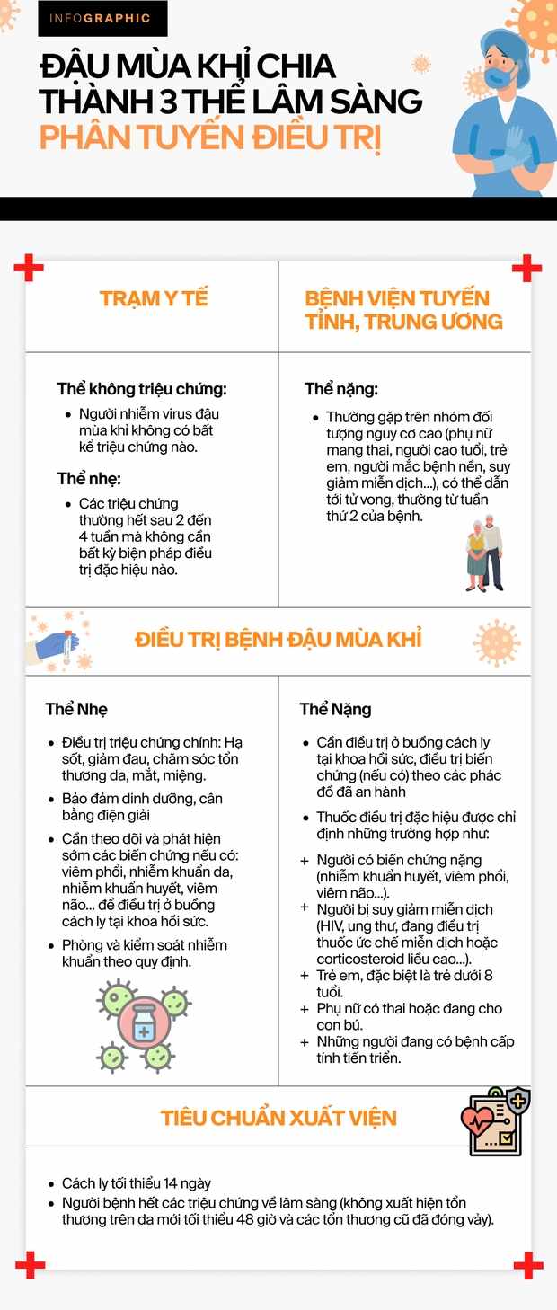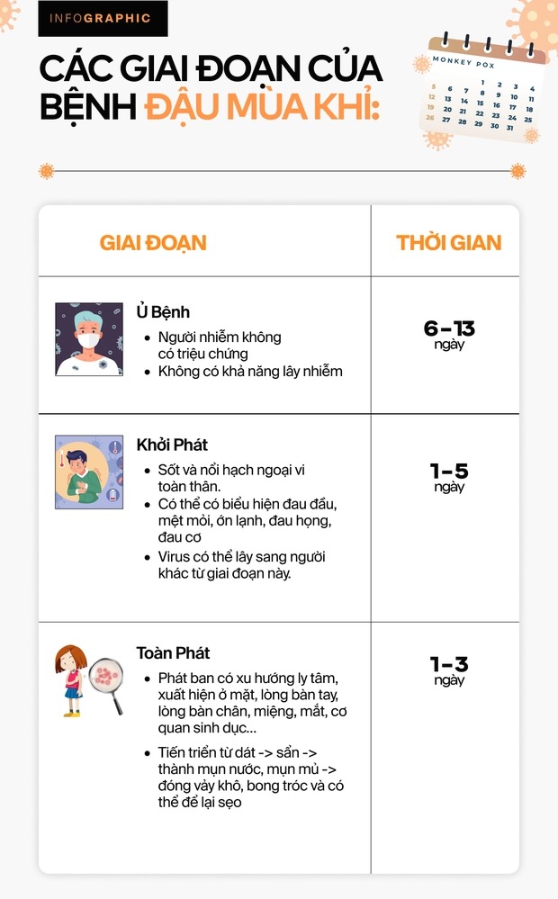 Bộ Y tế đã có Quyết định số 2099/QĐ-BYT về việc ban hành Hướng dẫn chẩn đoán, điều trị và phòng bệnh đậu mùa khỉ ở người. Theo hướng dẫn này, bệnh nhân mắc bệnh trải qua 4 giai đoạn khởi phát bệnh và phải cách ly tối thiểu 14 ngày.