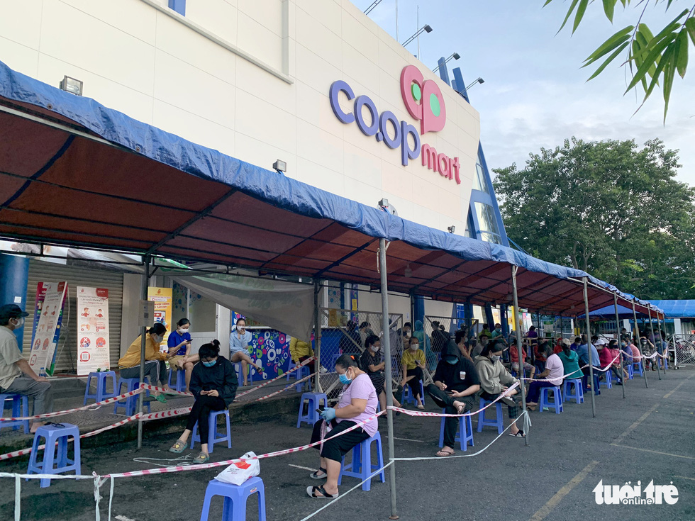 Người dân xếp hàng trật tự chờ siêu thị mở cửa - Ảnh: BÔNG MAI