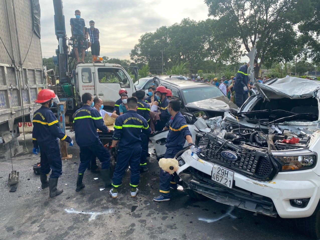 Tại hiện trường, do va chạm mạnh, đầu xe bán tải mang biển kiểm soát 29H-467.21 bị biến dạng khiến một người đàn ông trung tuổi chưa xác định danh tính ngồi bên ghế phụ xe bị mắc kẹt. Lực lượng cứu hộ đã sử dụng máy cắt và các thiết bị chuyên dụng đưa nạn nhân ra ngoài để cấp cứu.