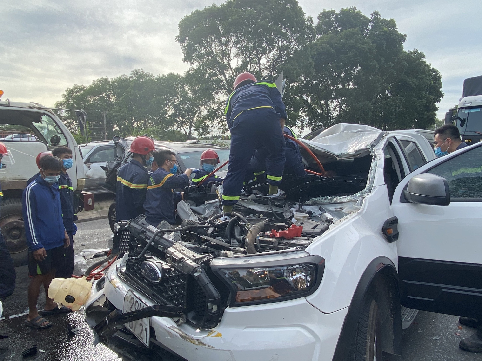 Do va chạm mạnh, đầu xe bán tải bị biến dạng khiến nạn nhân bị mắc kẹt. Lực lượng cứu hộ đã dùng máy cắt và các thiết bị chuyên dụng đưa nạn nhân ra ngoài...