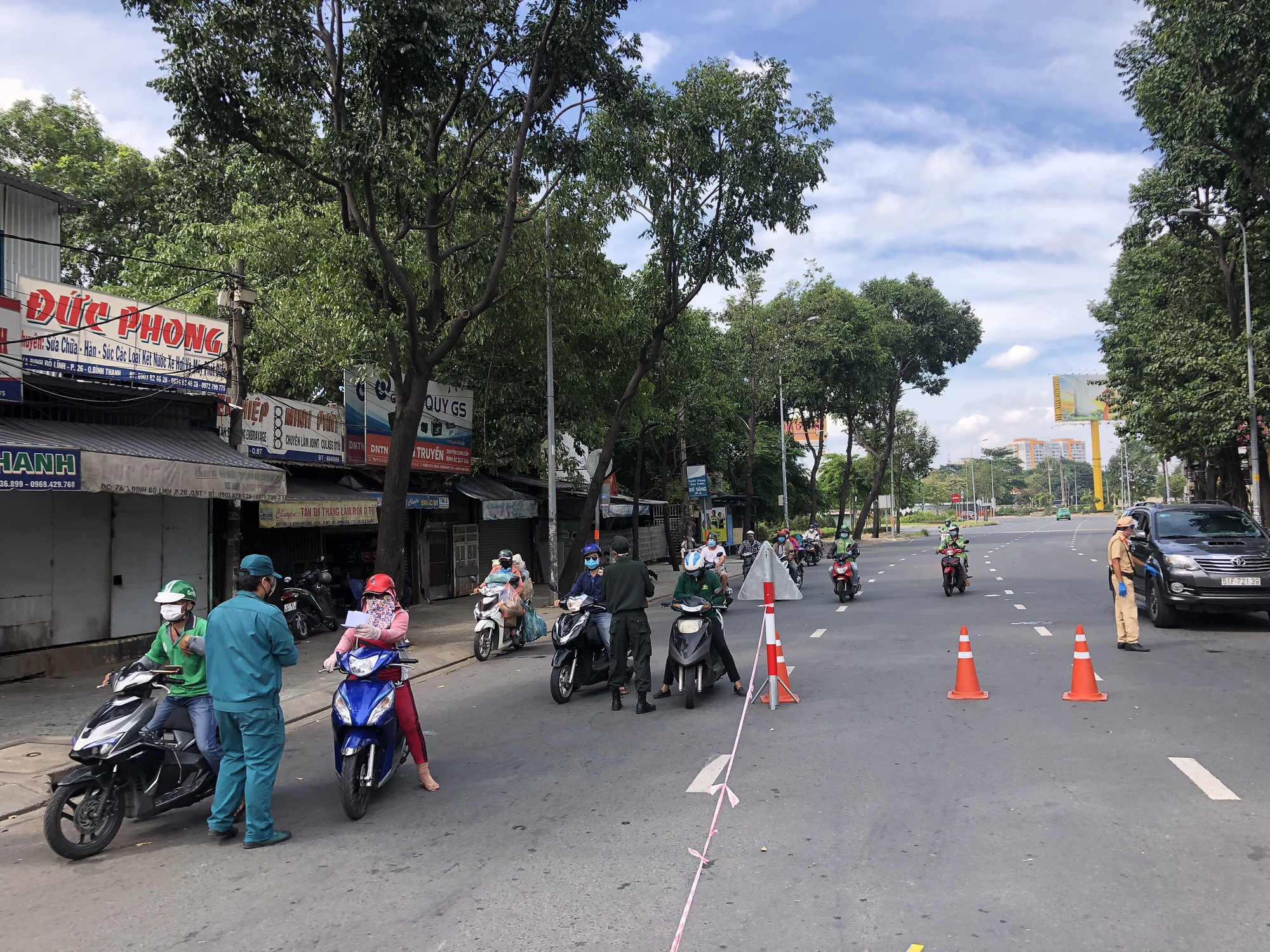 Hiện tại các chốt chỉ kiểm tra giấy đi lại, lý do người dân đi ra đường - Ảnh: CHÂU TUẤN