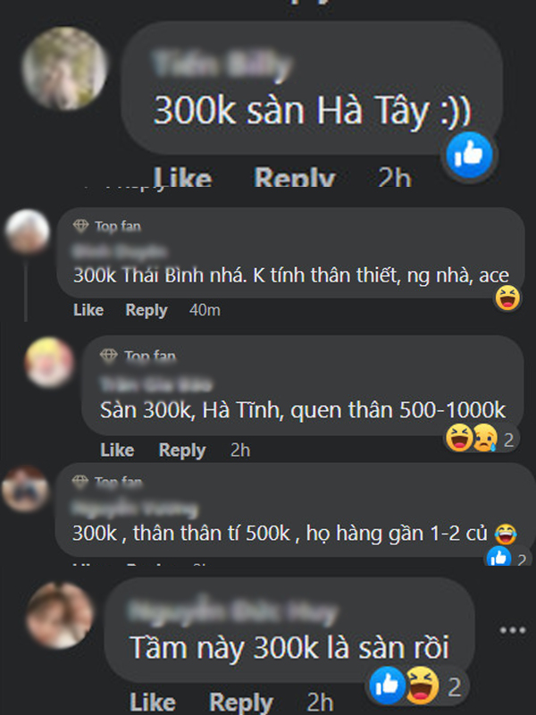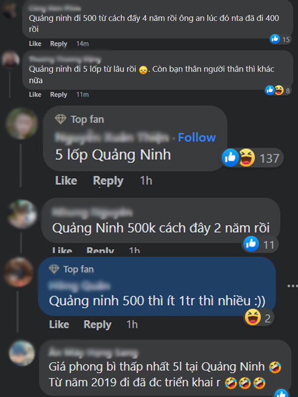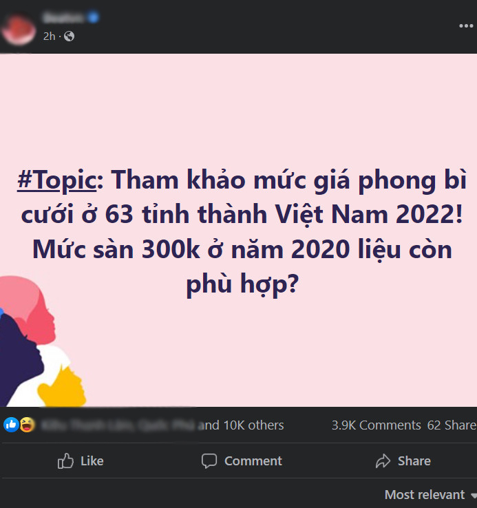 Chỉ sau 2 giờ đăng tải, bài đăng này đã có hơn 10.000 lượt tương tác và gần 4.000 bình luận. Theo đó, đa số mọi người đều cho rằng số tiền "sàn" - tức mức thấp nhất để bỏ phong bì cưới ở thời điểm hiện tại là 300.000 đồng ở các tỉnh thành. Quảng Ninh có phần nhỉnh hơn với con số 500.000 đồng.