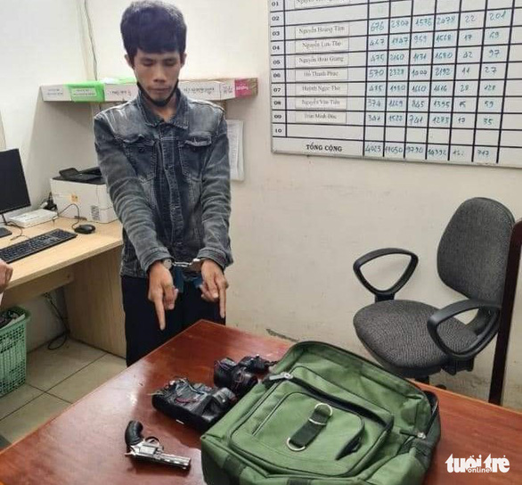 Nghi phạm Trần Thanh Luân và hộp quẹt có hình cây súng dùng để khống chế cướp ngân hàng - Ảnh: Công an Sa Đéc