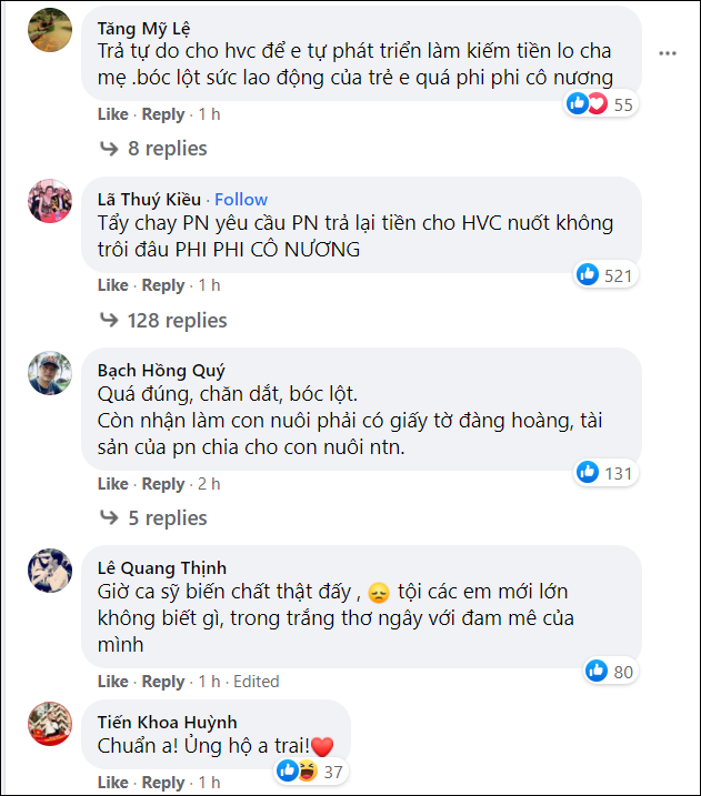 “Chính xác ạ, còn 1 số người nói là phải nuôi HVC ăn học thế Phi Nhung làm nhận con nuôi thì phải có trách nhiệm nuôi dưỡng, không nuôi được thì nói chứ ai có kiểu nhận con nuôi con phải đi hát để mẹ giữ số tiền đó chi trả cuộc sống…. Ui nói chung mình thấy bất cập vô lý nhiều!”